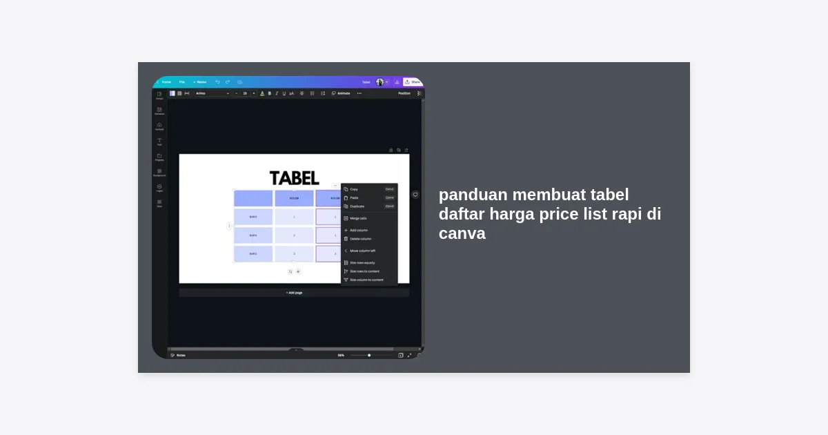 Salah satu pembaruan terbaik yang sering dilewatkan oleh pengguna dalam panduan membuat tabel daftar harga price list rapi di canva adalah fitur elemen “Table”. Dulu, pengguna harus membuat garis satu per satu secara manual. Kini, semuanya jauh lebih mudah.