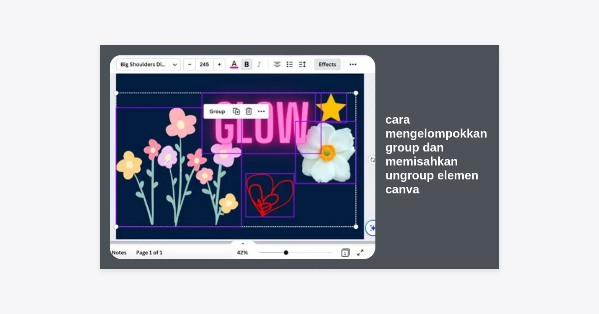 Secara sederhana, fitur Group di Canva memungkinkan Anda untuk menyatukan dua atau lebih elemen (teks, gambar, ikon, atau bentuk) menjadi satu kesatuan. Setelah dikelompokkan, elemen-elemen tersebut akan berperilaku seperti satu objek tunggal saat Anda memindahkan atau mengubah ukurannya.